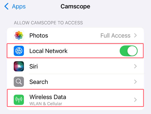 IOS: Settings - App - Camscope - Local Network "ON" and Wireless Data selects "WLAN" or "WLAN & Cellular Data".